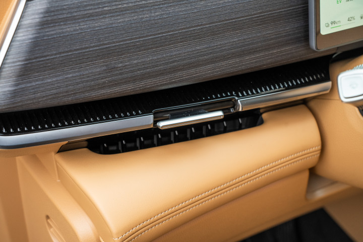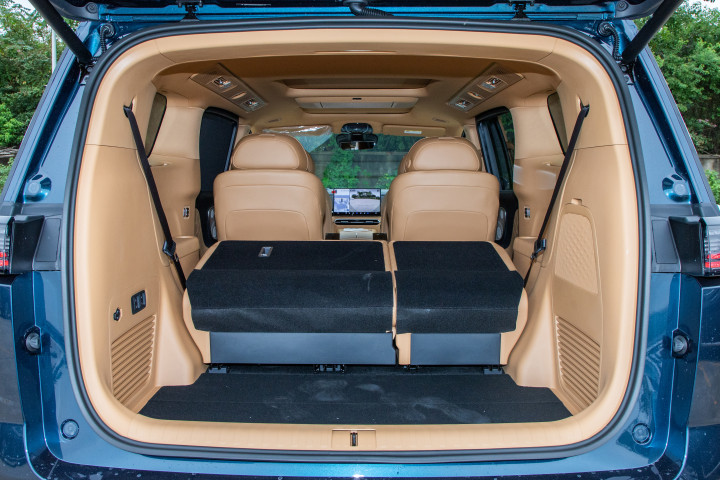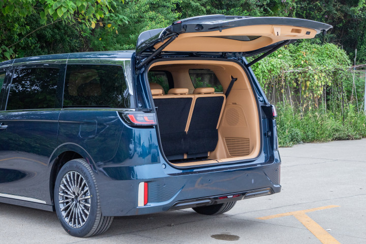 储物空间的设计也体现了满满的巧思,全车共有23处储物空间。中控台采用悬浮式设计,下方留出了宽敞的置物区域,放个手提包或者随身小物件都很方便;第二排小桌板下方还隐藏着一个抽屉,可以用来放文件、零食等物品,既私密又实用,让每一寸空间都能得到充分利用。 后备箱的装载能力也很出色,常规容积为502L,轻松能装下8个20寸登机箱,而且还有富余空间。如果需要装载更大的物品,放倒第三排座椅后,后备箱容积可以扩展至2700L,不管是一大家人的出行行李、露营装备,还是偶尔需要搬运的大件物品,都能轻松容纳。
