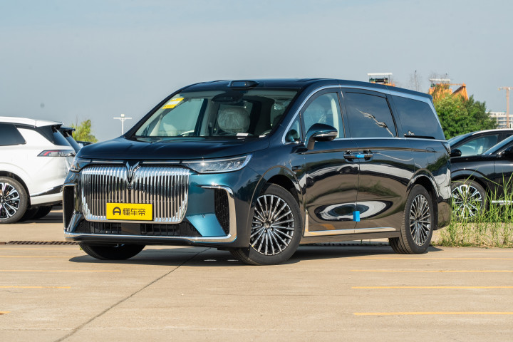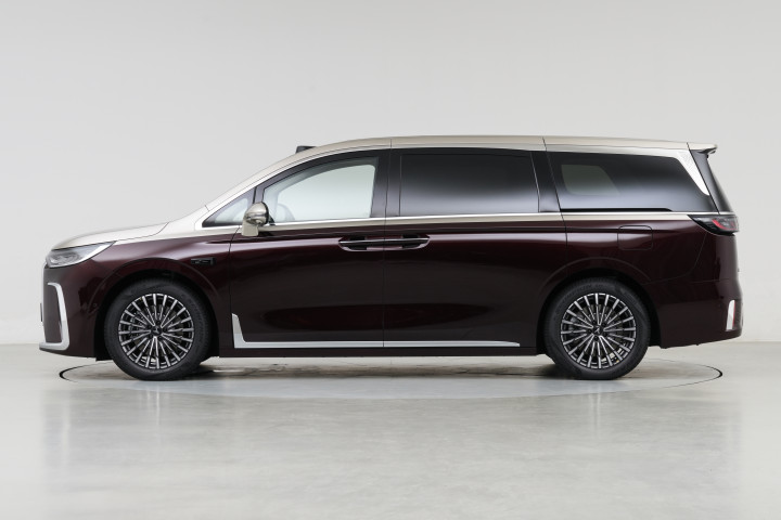 车身侧面的线条很平直,车顶带着一点弧度,采用了悬浮式设计,这种设计在MPV车型中很常见,既能保证车内头部空间充足,又让车身看起来更具现代感。段式设计的下包围和两侧的垂直导流槽搭配得不错,不仅视觉上更有张力,行驶时还能帮助梳理气流,让车身姿态更稳定。隐藏式滑轨比传统MPV的外露式滑轨整洁很多,再配上19英寸多辐轮毂,让这台大型MPV多了几分灵动。